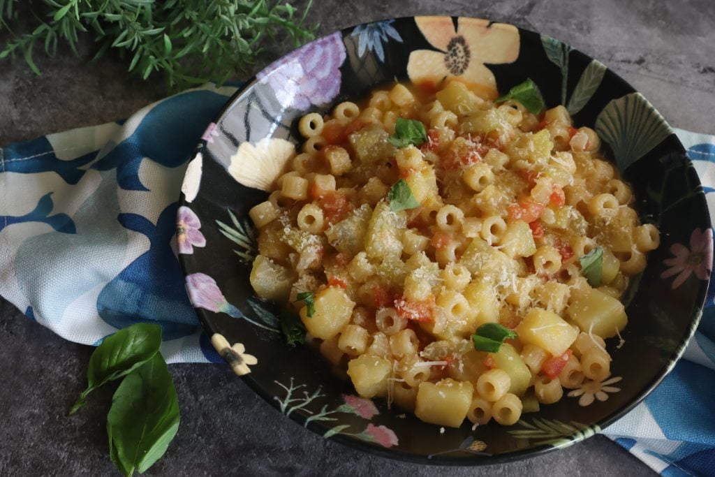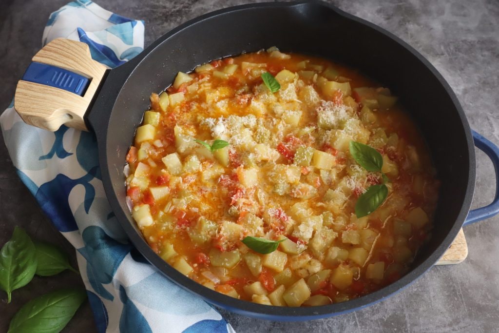 Whenever I find the Sicilian long zucchini at local markets during the summer, I always buy it. It’s hard to resist since it’s available only during a few select times of the year. Actually, this is a gift: I received a package from Sicily with this and other delights. I prepare it just like my mom did and how my sisters do. So simple, with tomato, potatoes, and onion.