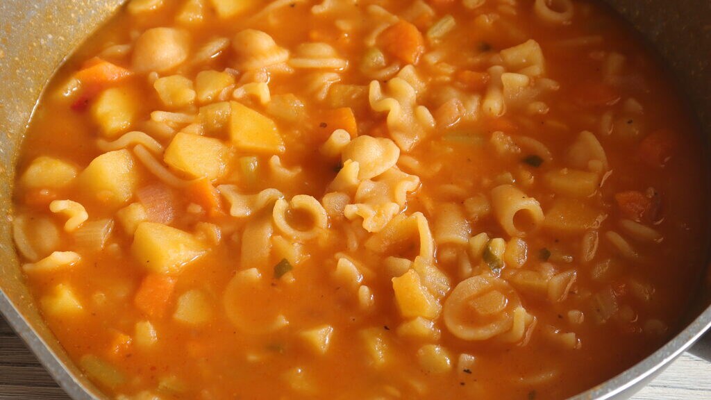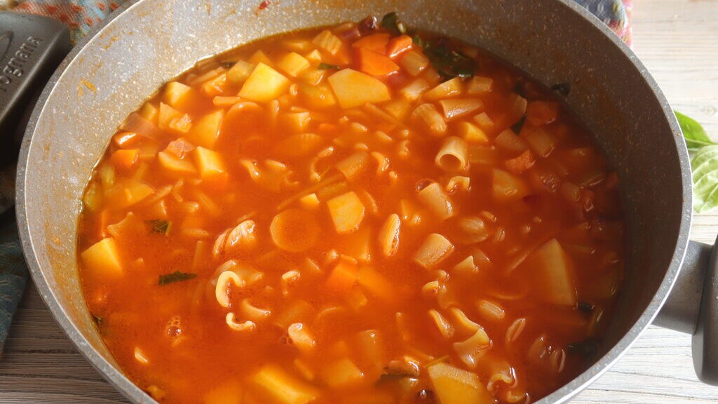 • Cook for 10 minutes, adjust the salt, and add the pasta.