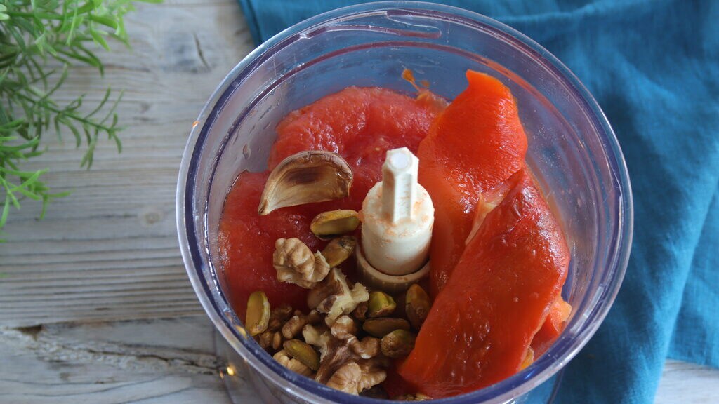 In the chopper, I added the tomatoes, bell peppers, garlic, bread, oil, salt, walnuts, and pistachios.