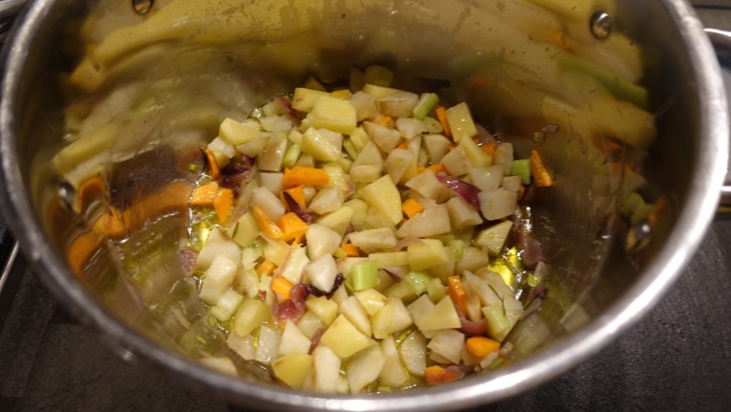 • Pour two tablespoons of oil in a large pan and wilt the onion with the leek. Add the carrot, celery, and potatoes, all chopped naturally, and finally the Jerusalem artichokes.