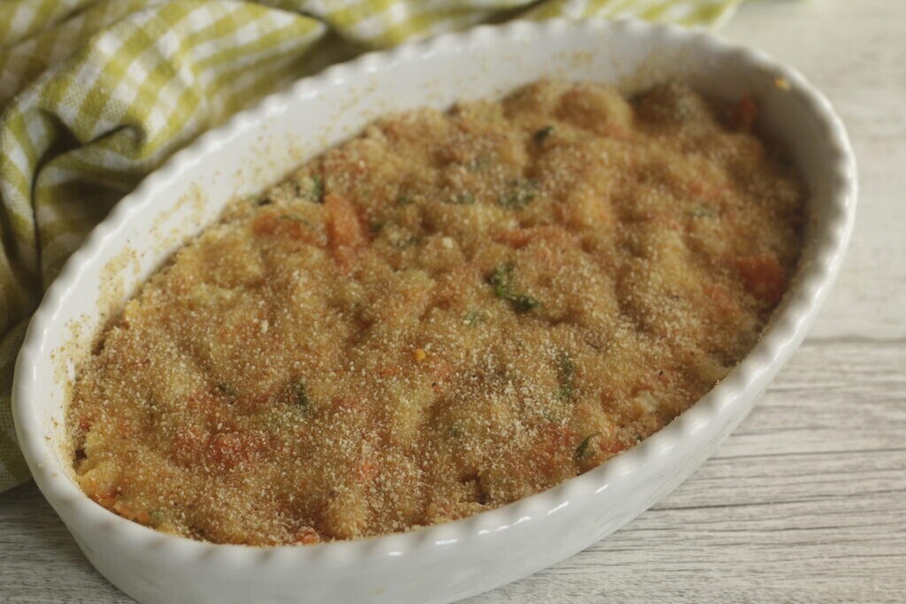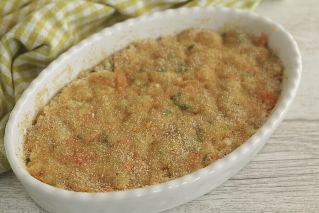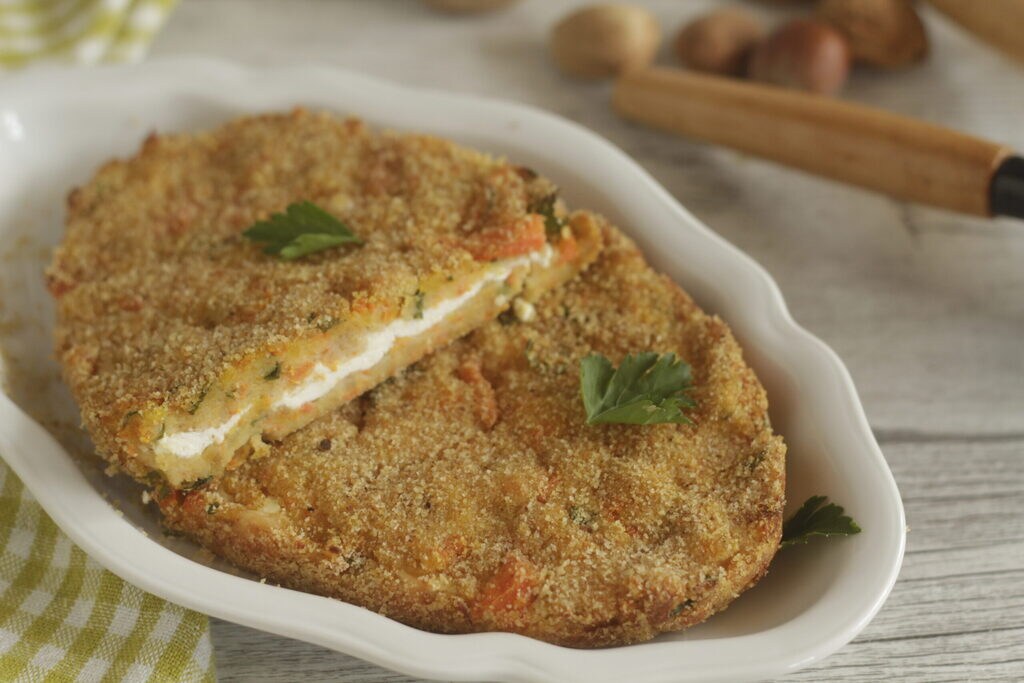 • Divide the carrot and potato puree in two and spread one part in a baking dish with butter and breadcrumbs, distribute the ricotta in the center, and cover with the rest.