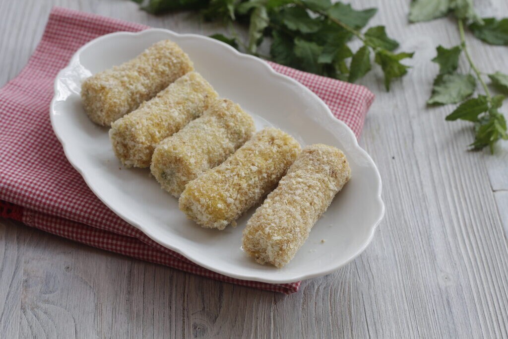 Season the potatoes with the egg, parsley, salt, breadcrumbs, and pepper. Mix everything and form a cord, cut into sticks and pass them in flour, egg, and breadcrumbs.