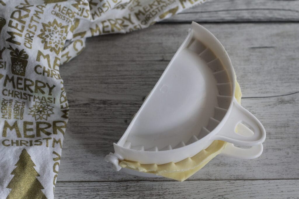 Place the cut pastry on the dumpling pastry cutter, in the center put 1 oz of sautéed Savoy cabbage with 0.53 oz of ricotta, a pinch of salt, and a drizzle of oil.