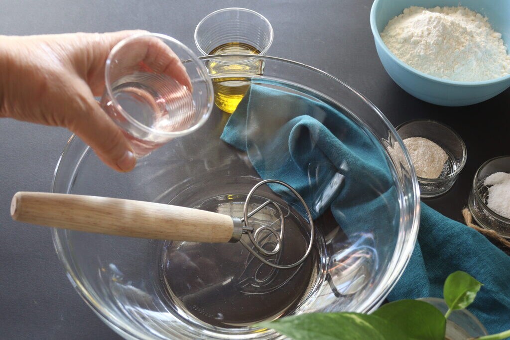 If you find it more convenient, you can knead on the pastry board; otherwise, it’s fine in the glass bowl with the whisk first and with your hands later.
