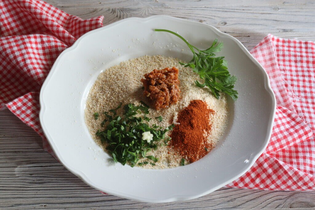 I should note that I had the fishmonger fillet the mullets for me as there were only three and they were large. I prepared my breading with breadcrumbs mixed with minced garlic and parsley, salt and pepper, some sweet paprika, and sun-dried tomato pâté, which I made myself. I’ve included the link in blue, but I am sure you can find excellent ready-made options in specialized stores and supermarkets. Lastly, add some grated lemon zest to the breadcrumbs for that final flavor touch.