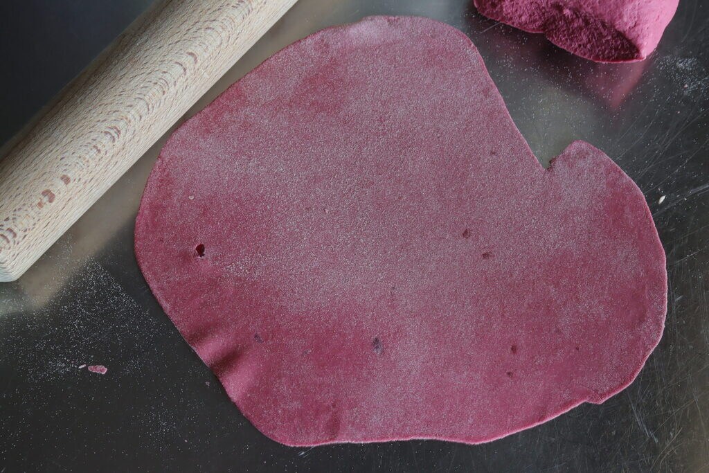 Red ravioli with butter and sage, I would say it’s more of an intense purple because I used peeled beetroot and pureed it in the mixer. In our gastronomic tradition, the king of dishes is certainly pasta, the main course, and not as many believe, the appetizer, which is more of an international derivation classifying the appetizer as a main dish. Homemade pasta is a true family ritual passed down from generation to generation. Making homemade pasta is an ancient tradition that today is increasingly difficult for women, especially with time running short, but the pleasure of preparing and serving steaming ravioli made by us is still a great satisfaction and not that difficult, I might add.