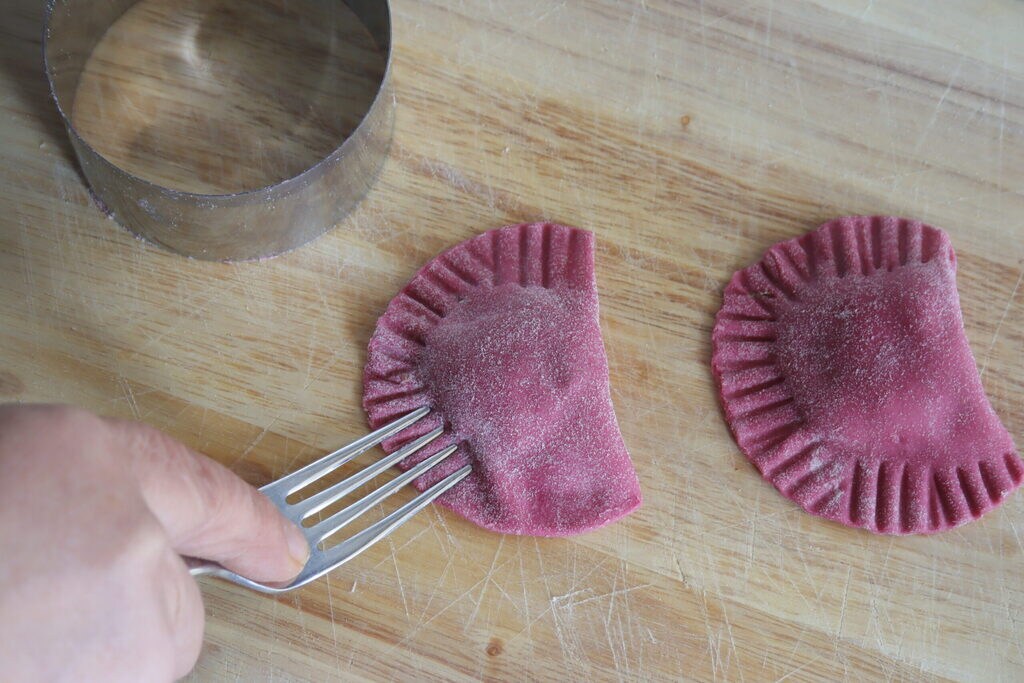 • With a food brush, moisten the pasta around the filling with water, fold the pasta over, and press the edges together with your fingers. Use the cookie cutter to cut the ravioli into half-moons and seal with the tines of a fork.