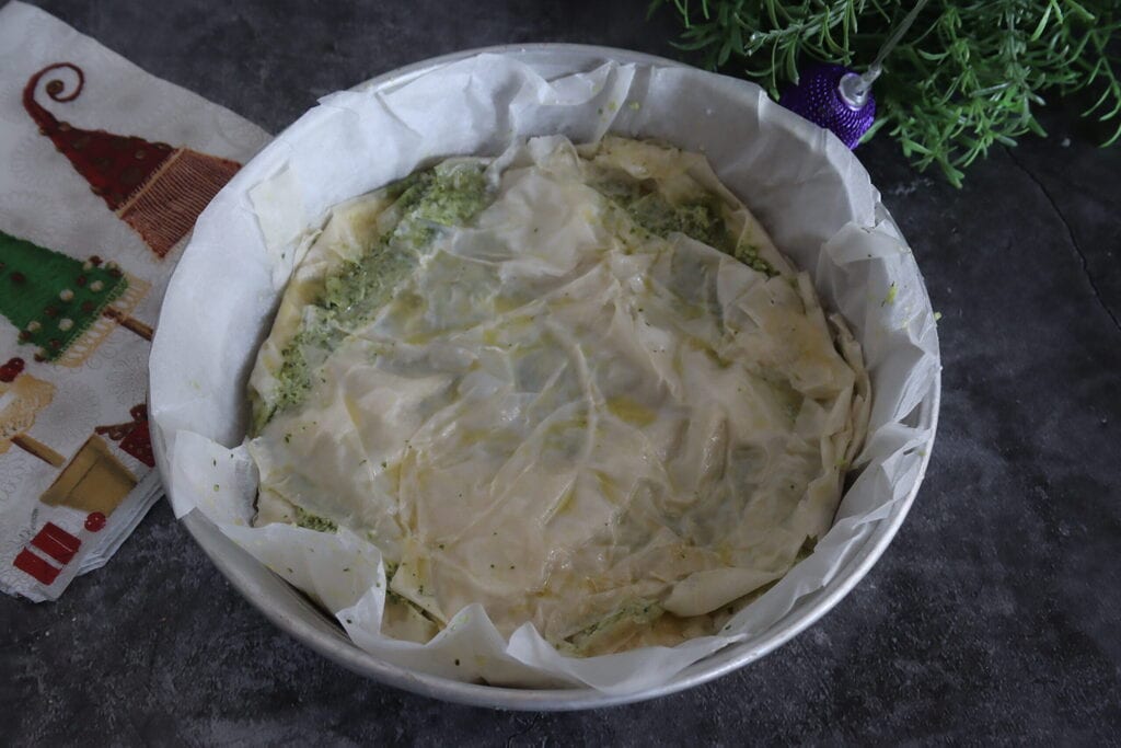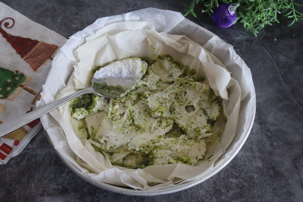 In a round pan with parchment paper, I start with a layer of fillo dough, with the silicone brush I spread pesto on the first layer, add a second sheet and besides the pesto also distribute half of the ricotta.