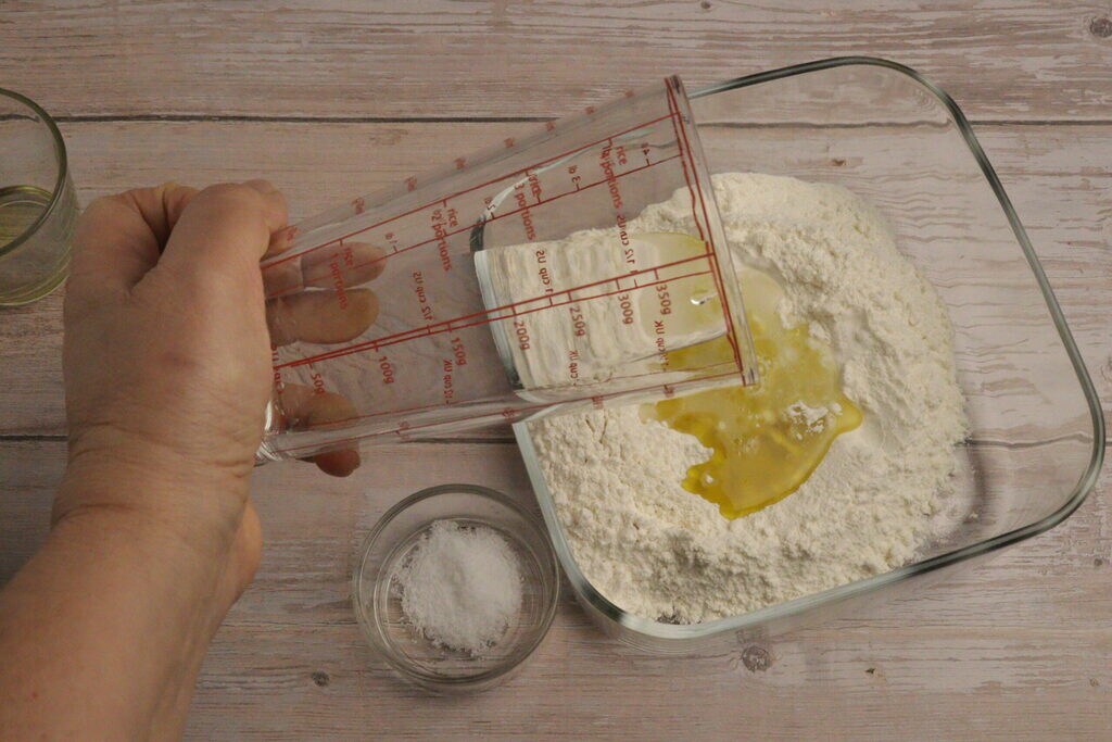 • Place the flour with the oil in a bowl, or directly on the kneading board,