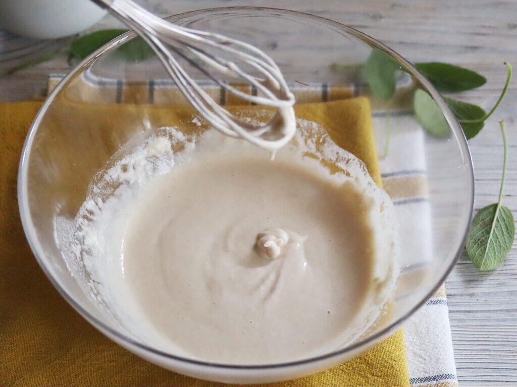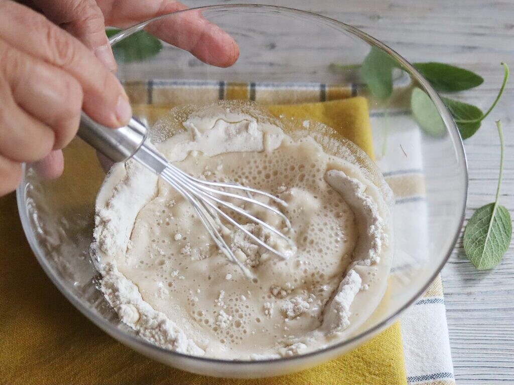 Keep stirring until the batter becomes smooth and homogeneous, let it rest for a moment before using it, just the time to thoroughly dry the sage. In a small pan, bring the peanut oil to temperature, 338°F just to not exceed the smoke point. Fry the sage after dipping it, holding it by the stem, one leaf at a time in the batter.