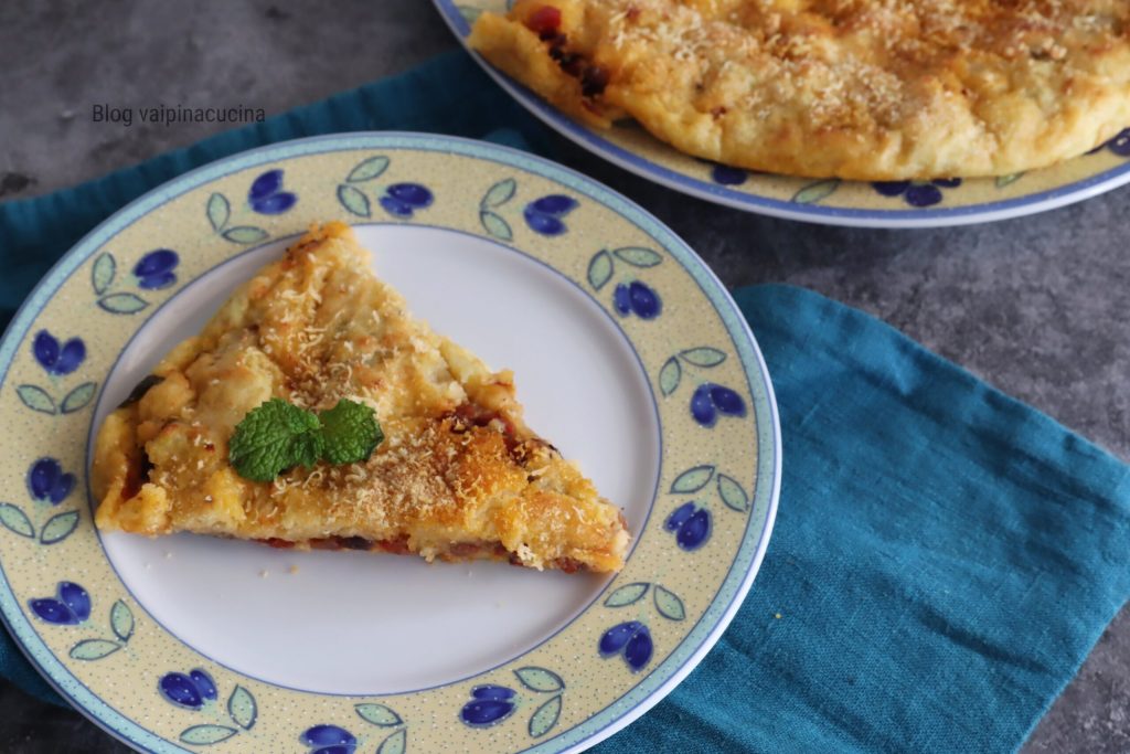 Salentine potato pie, a kind of focaccia consisting of two layers of seasoned mashed potatoes, with a filling of onions cooked with tomatoes, olives, capers, and anchovies. Oregano is essential to seal this Southern recipe. The two layers of potatoes are properly seasoned with mint, eggs, plenty of pecorino, breadcrumbs, salt, and pepper. If desired, the filling can be enriched with ham, tuna, sardines, or plenty of vegetables, as I like it. It is obvious that anyone who has been to Puglia and has tried the local cuisine finds it difficult to forget and even more difficult to come back home and not try to reproduce the same flavors.