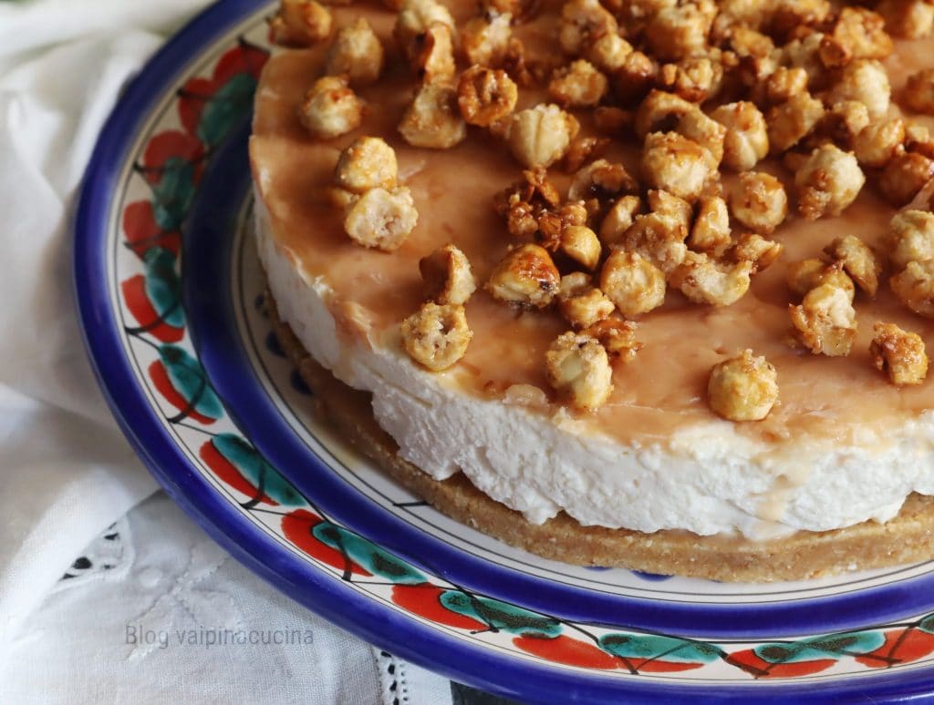 Before serving the cheesecake, remove the pastry ring and pour the salted caramel over the cream and decorate with caramelized hazelnuts.