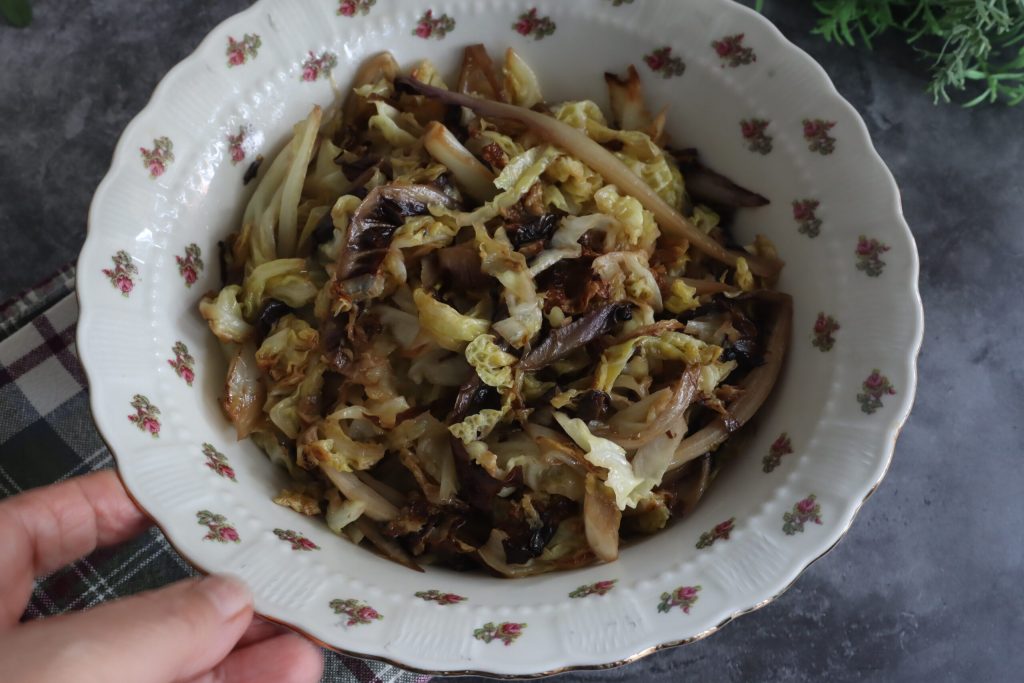 After washing them, I sliced the radicchio and Savoy cabbage finely and cooked them for 15 minutes with two tablespoons of extra virgin olive oil.