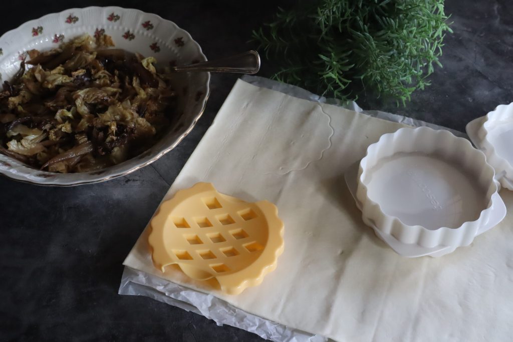 I unroll the puff pastry and cut the tarts with the molds.