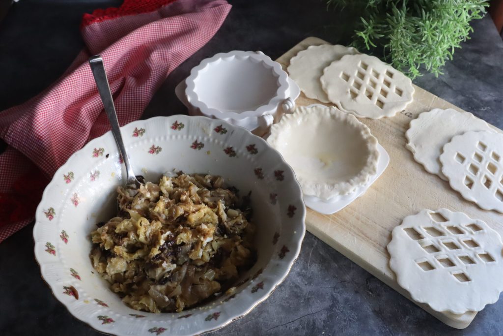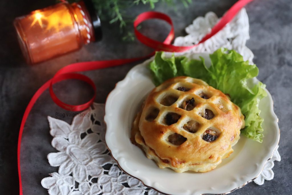 Savory Christmas tarts with sautéed vegetables. A few years ago, I bought a kitchen tool that allowed me to prepare quite large tarts, which to me do not seem small enough to be called tartlets. Tescoma’s Delicia can be found in all home goods stores. Obviously, I can’t resist when I see an item that is new to me and could be useful in my kitchen. Yesterday, as I was tidying up cabinets and drawers (they go in sequence: once you organize one, the second follows), I found the perfect ingredients. My fridge almost never lacks a rolled puff pastry, cooked and raw vegetables, eggs, and cheese: they are practically essentials on the shopping list. With these ingredients, I prepared these charming savory Christmas tarts, also good for freezing.