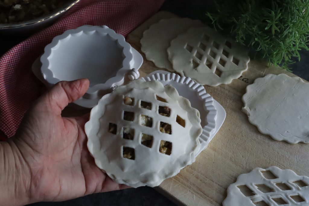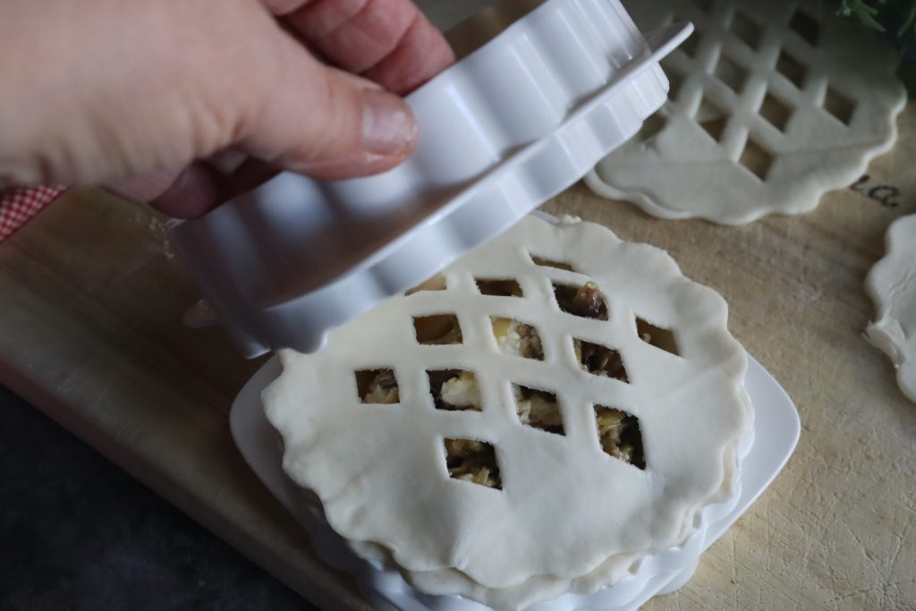 The molds not only cut the puff pastry, but they also seal. So, with the brush, I slightly dampened the edges of the tart bases.