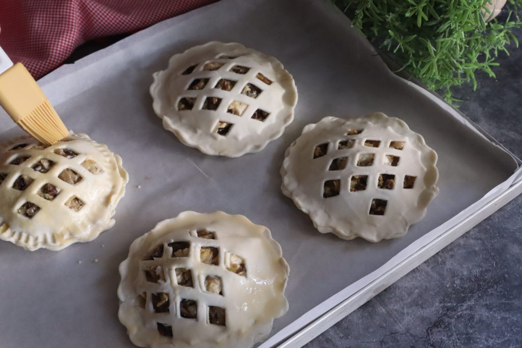 With the same brush, I spread egg and milk together on the savory Christmas tarts.