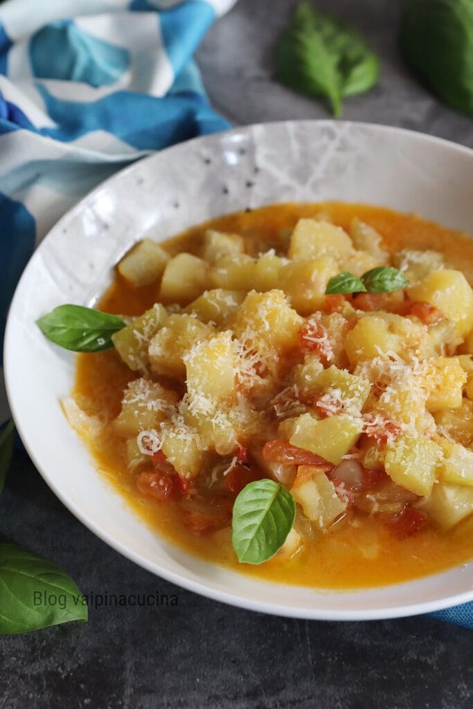 • Chop the onion into small pieces, lightly sauté them with a little oil in a pan for a few minutes, then add the zucchini with diced potatoes, cover and let them fry for a while. Add the chopped tomatoes and adjust the salt, now add two glasses of water and let it cook for 20 minutes with the lid on over medium-low heat. Once cooked and before serving, add grated cheese. If you like, you can add some Parmesan crusts cut into pieces during cooking, I often do, I assure you the taste is fantastic.