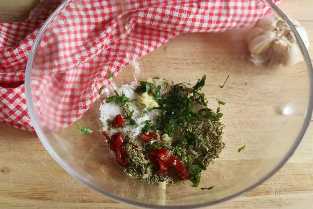 Place all the dry ingredients in a bowl, the chopped hot pepper, salt, oregano, and parsley washed, dried, and finely chopped. For the garlic, I used a convenient garlic press, no need to peel it first.
