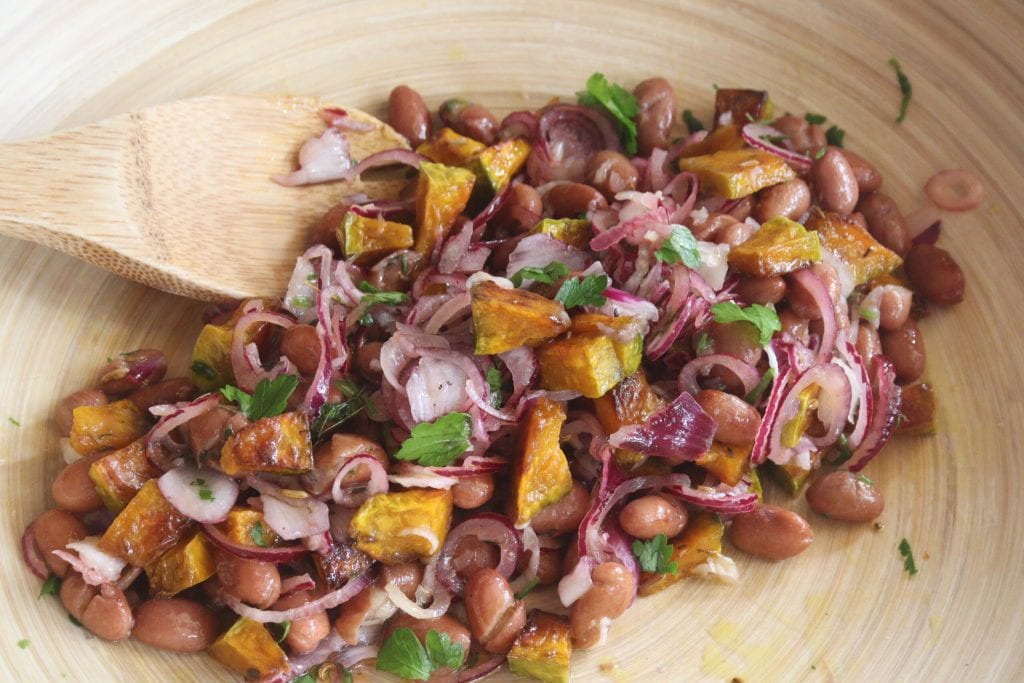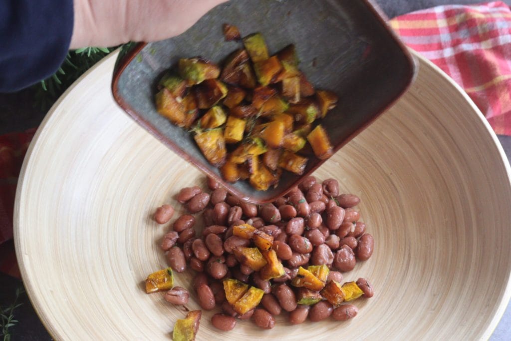Side dish of borlotti beans and pumpkin with onions: a fantastic and quick side dish to prepare, I would also say tasty with oven-cooked Delica pumpkin. I have described this dish as a side dish, but in reality, it could easily replace a main or first course thanks to the presence of beans, one of the richest plant-based foods in proteins, calcium, phosphorus, and iron, many minerals and vitamins, not to mention the starch in dried ones, a true source of energy. Surely a discouraging reason that dissuades us from using dried ones is the long soaking and cooking times. But technology helps us: we all know the pressure cooker and the 90-minute boiling time is reduced to 35 minutes, which is not insignificant. As for soaking, just remember to soak them in cold water in the evening. In this regard, I would like to reveal a secret to make legumes more digestible: leave them to soak for several hours, frequently changing the water, this will prevent fermentation and with slower and prolonged cooking, you will eliminate some undesirable substances. In this case, the beans will be more digestible.
