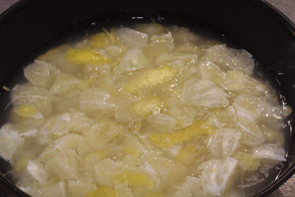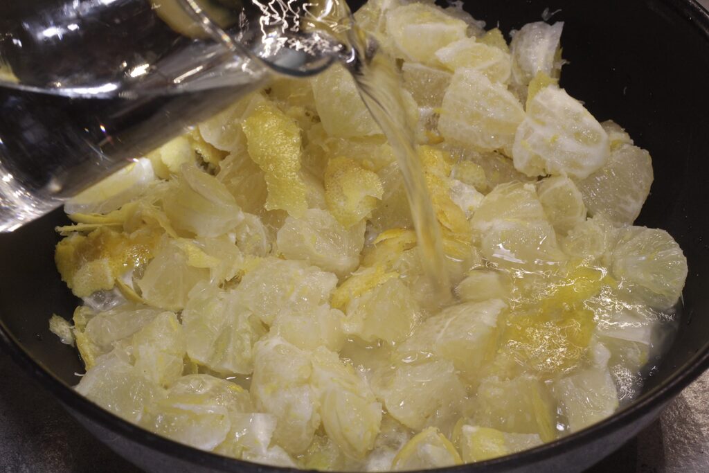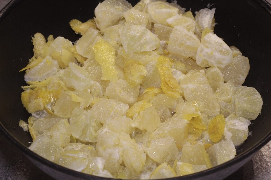 It is important to clean the lemons from the white pith, otherwise, it would make the jam very bitter. Use a small knife to remove the peel first, which you will use, avoiding the white part and leaving only the clean segments. It is important to add the peel, as it contains the pectin that will help thicken the jam.