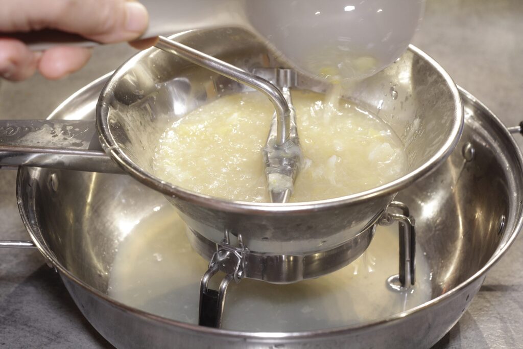 At this point, turn off the heat and carefully using the food mill, turn the mixture into a puree.