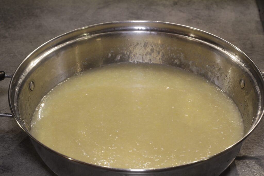 As with all fruits with skin, remember that the weight is considered net, i.e., without seeds, skin, and white parts. At this point, we add equal weight of sugar and water.