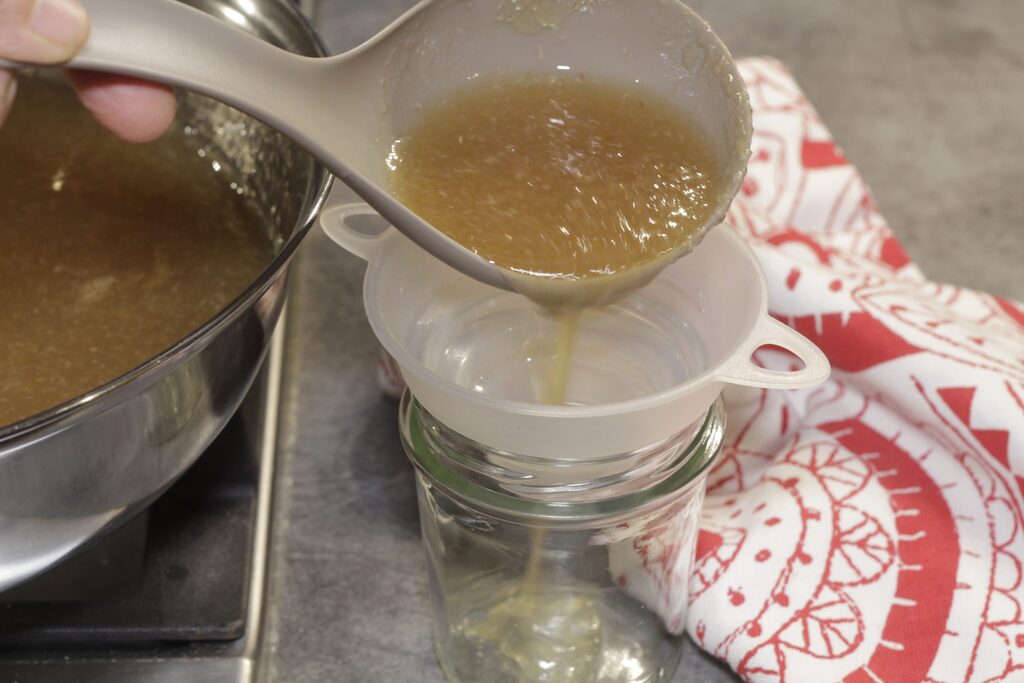 Use a funnel for jams to avoid dirtying the edges of the jars, fill and seal.