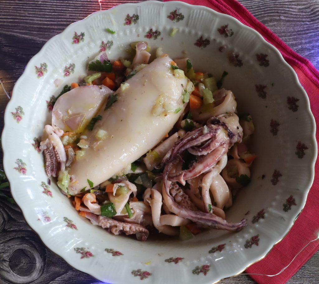 Now I’ll tell you how I prepare the simple squid salad. After cleaning them, I wash the squid and, on the cutting board, cut them into small pieces.