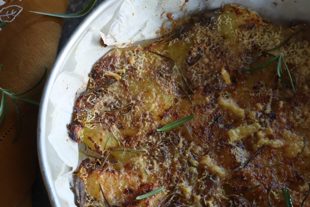 • I grate the Pecorino and sprinkle it evenly over the potatoes.