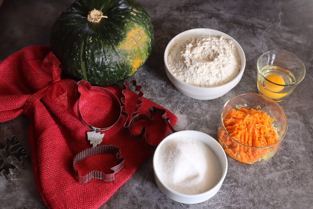 Place the flour with the sugar, pisto, and baking powder in the stand mixer, start and mix all the powders. Add the cooked pumpkin (150 g will be enough), the egg, and the oil. Mix for a few seconds and then let rest for 30 minutes in the refrigerator before preparing the soft pumpkin cookies.