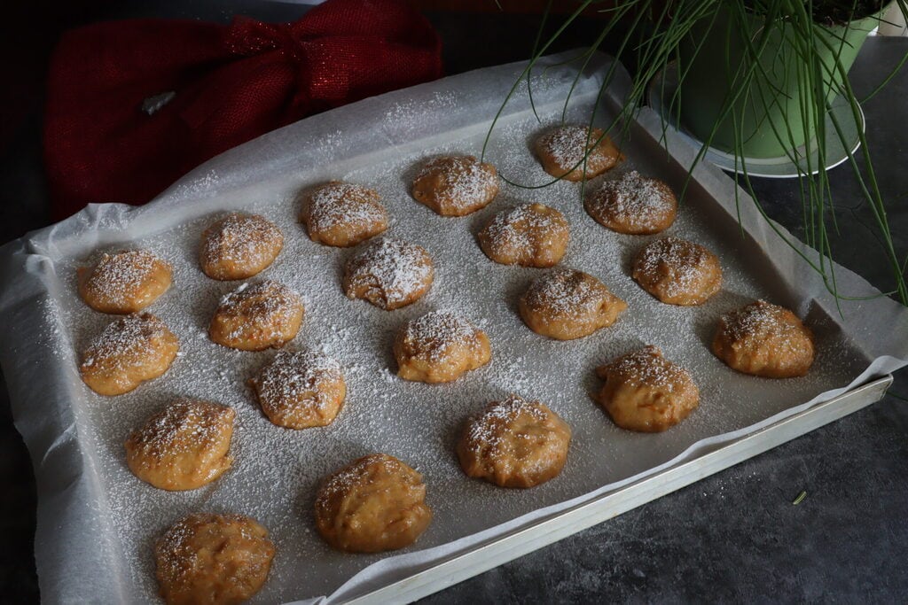 Use 2 tablespoons to form balls of 1 to 1.5 oz each, place them on the baking sheet with parchment paper. Sprinkle them with powdered sugar.
