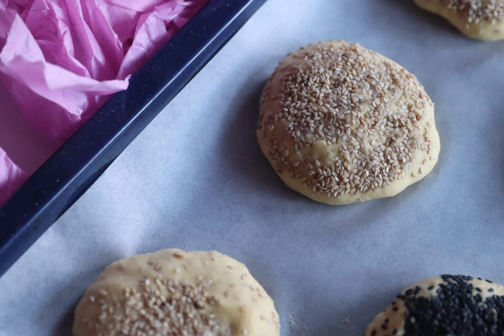 • On 4 rolls I put sesame and on the other 4 the black sesame. Without adding more flour, I pour the sesame on the work surface and, after shaping the dough balls, I press them onto the seeds so they stick well. I place the rolls on the baking sheet lined with parchment paper, cover them and let them rest for 30 minutes.