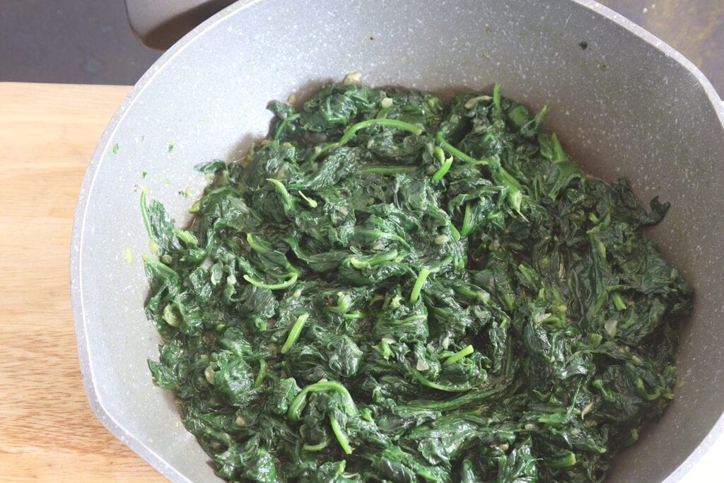 • Once the spinach is cooked and warm, crumble the feta directly with your hands, mix the two ingredients together, and adjust salt and pepper.