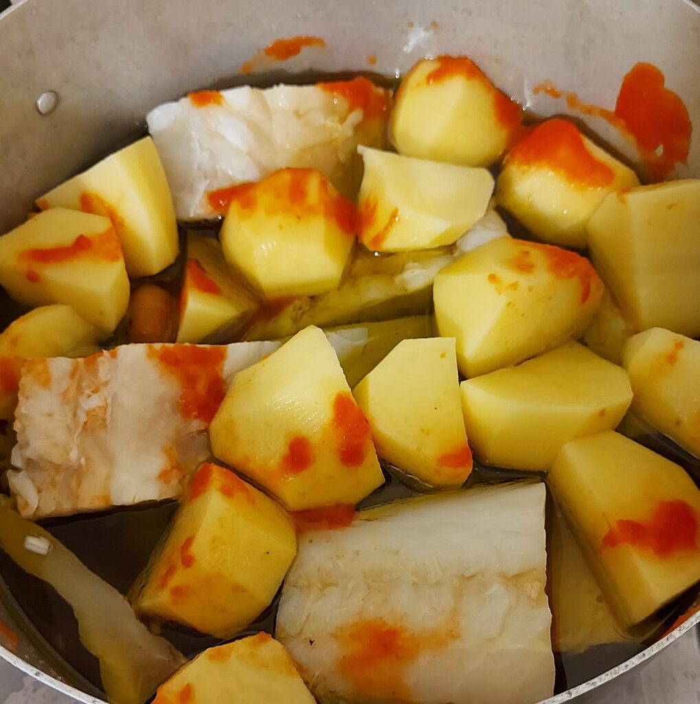 The skin of the stockfish should not be removed, at least not in this case. Nothing is fried, everything is layered and should not be stirred. This was my mom’s method, which then became mine too.