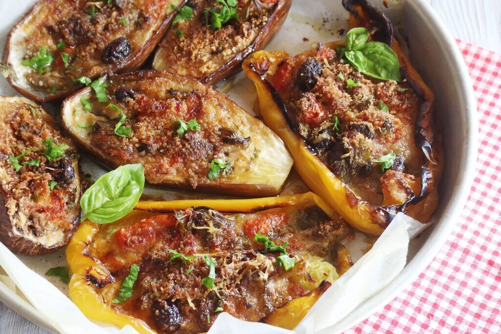 • I wash all the herbs and the eggplants with the bell peppers. I cut the bell peppers and eggplants in half lengthwise. I remove the seeds from the bell peppers and make cross cuts in the eggplants lengthwise. In a bowl, I place the breadcrumbs, chopped basil with garlic, wash the capers from the salt, and finely chop them along with the olives. I add the pecorino with a pinch of salt and a dash of extra virgin olive oil. I distribute this seasoning over the bell peppers and eggplants, add a little more oil on top, and place them in the oven at 375°F for 30 minutes. After the time has passed, let them rest for a moment and serve while still hot.