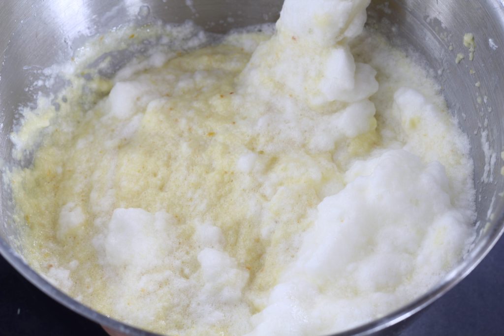 • Gently add the sieved ricotta and the now warm semolina to the eggs. Beat the egg whites to stiff peaks and fold them into the mixture with a spatula from the bottom up without using the stand mixer to avoid deflating them.