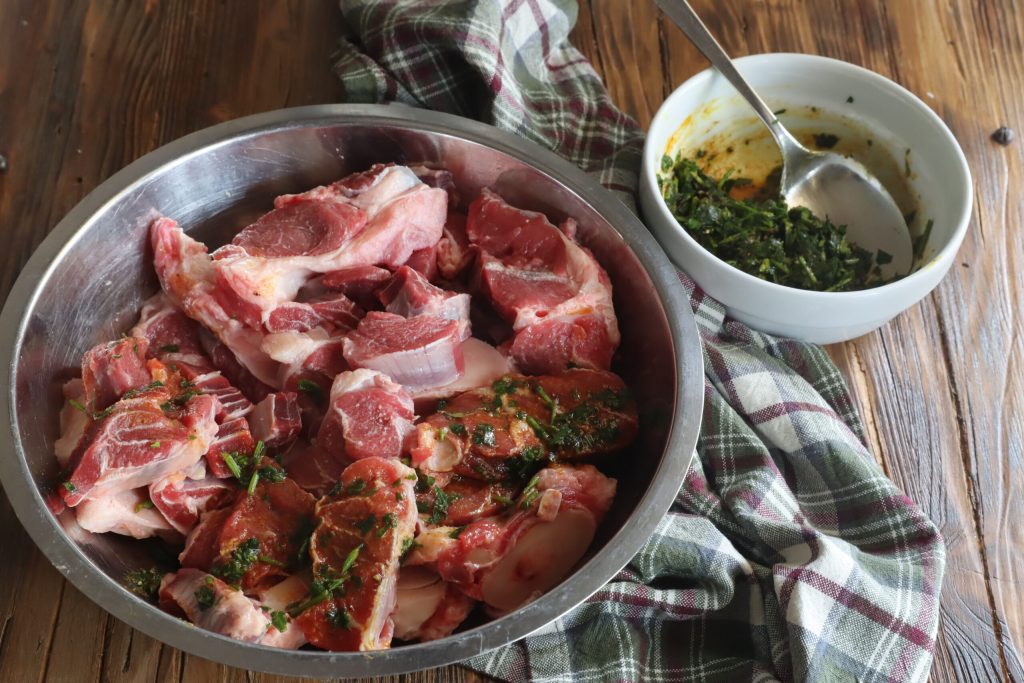 I brush the marinade with oil and all the spices over the meat, massaging it well so that each piece is fully covered.