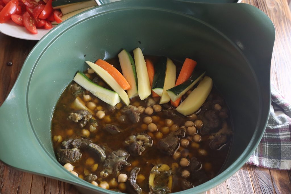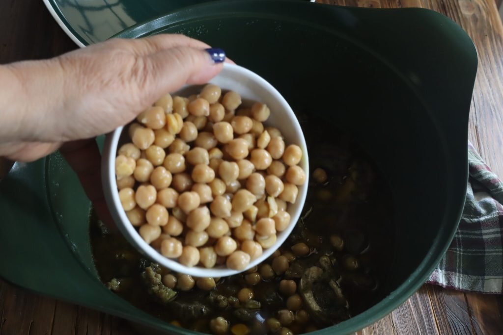 After 30 minutes of cooking the tajine, add the chickpeas and stir to distribute them evenly in the pot.