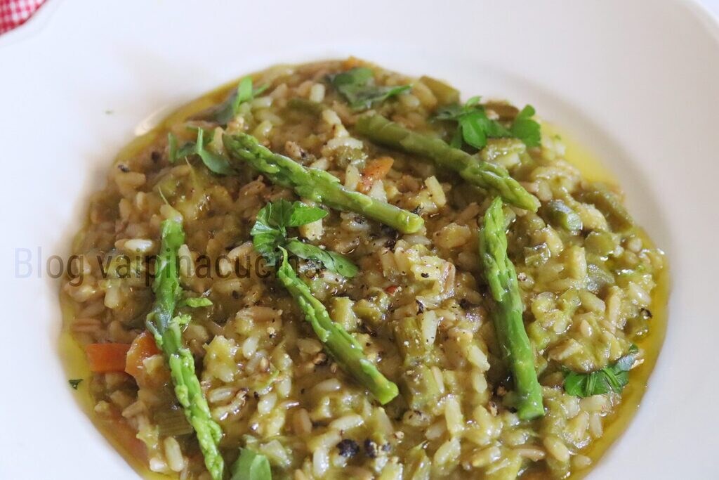 I clean the asparagus, set aside some tips to use for plating decoration, and cut the rest of the stems into small pieces. I put in the pan along with two tablespoons of oil, the whole garlic clove, and the onion with the shallot finely chopped, let it brown and pour in half a glass of white wine, add the asparagus, and half a glass of water, cover and cook for five minutes. After the time has elapsed, add the grain trio: rice, wheat, and oats, meanwhile heat some water to add as cooking progresses as needed. In 18 minutes, the rice, wheat, and oats trio is ready, I add the asparagus tips (previously blanched), chopped parsley, freshly ground black pepper, and extra virgin olive oil. Ready to serve.