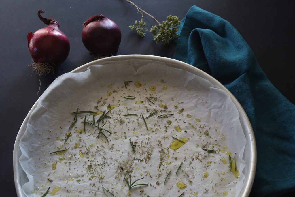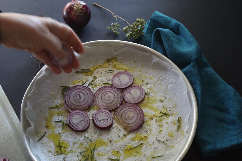 Place parchment paper brushed with extra virgin olive oil, some rosemary leaves with salt and oregano over the baking pan.