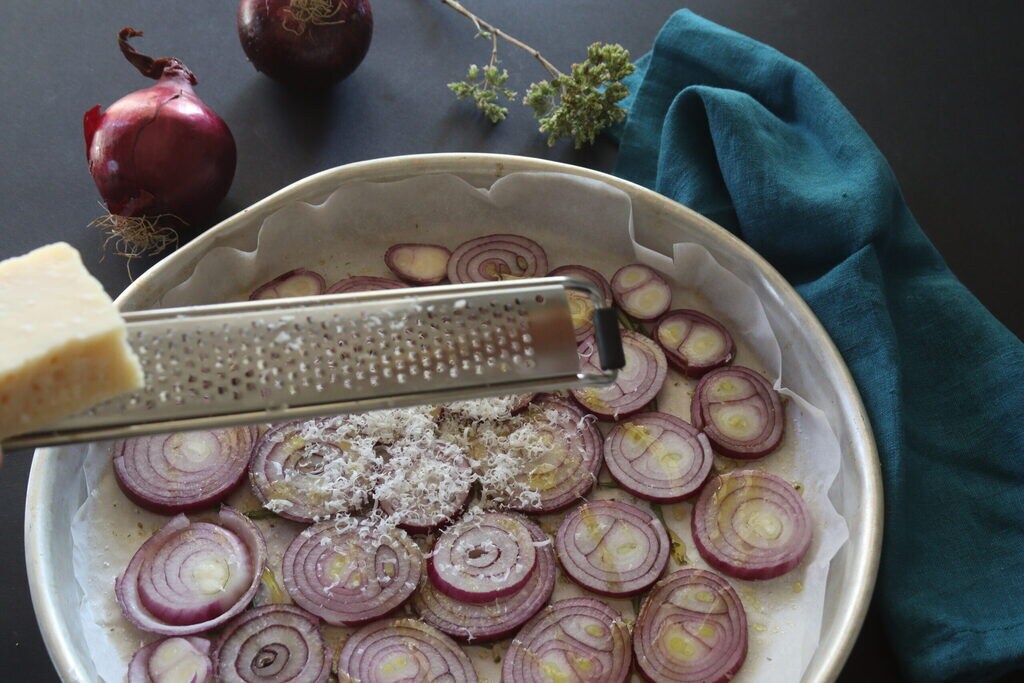 Tropea Onion Tarte Tatin, let’s immediately say that the tarte tatin is a cake (usually the original is made with apples typical of France) upside-down in which the fruit and in this case the onions are caramelized. Let’s get to know the onions a little better. There are many varieties of onions which for practicality we summarize in three groups: red, golden, and white, which we all obviously know. The red and golden ones are autumnal, and here come the Tropea onions, sweet with a unique flavor that I will use today for my tarte tatin, and then there are those summer ones, the white ones. I premise that all year round all the qualities of onions are on the market, and naturally also those from Tropea. Indeed, Tropea onions start in October and we find them until the end of March.