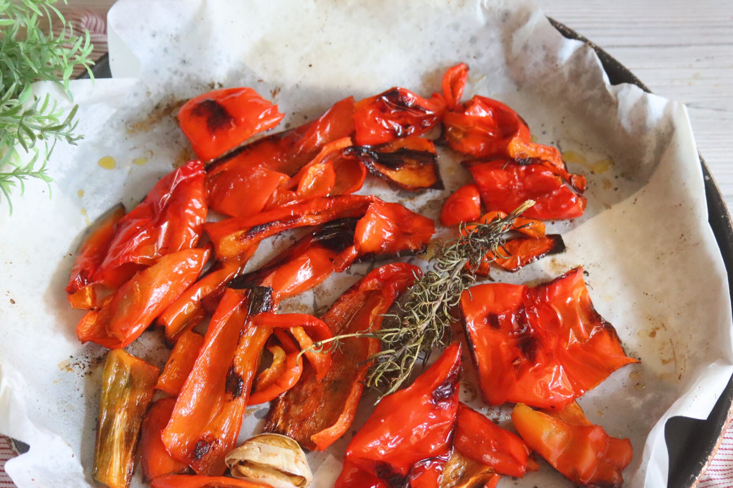 • Cut the bell peppers into strips and season them in a pan on parchment paper with salt and EVO oil, a nice sprig of rosemary, and a clove of garlic.