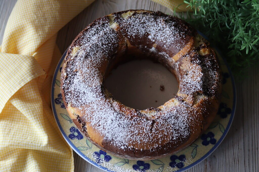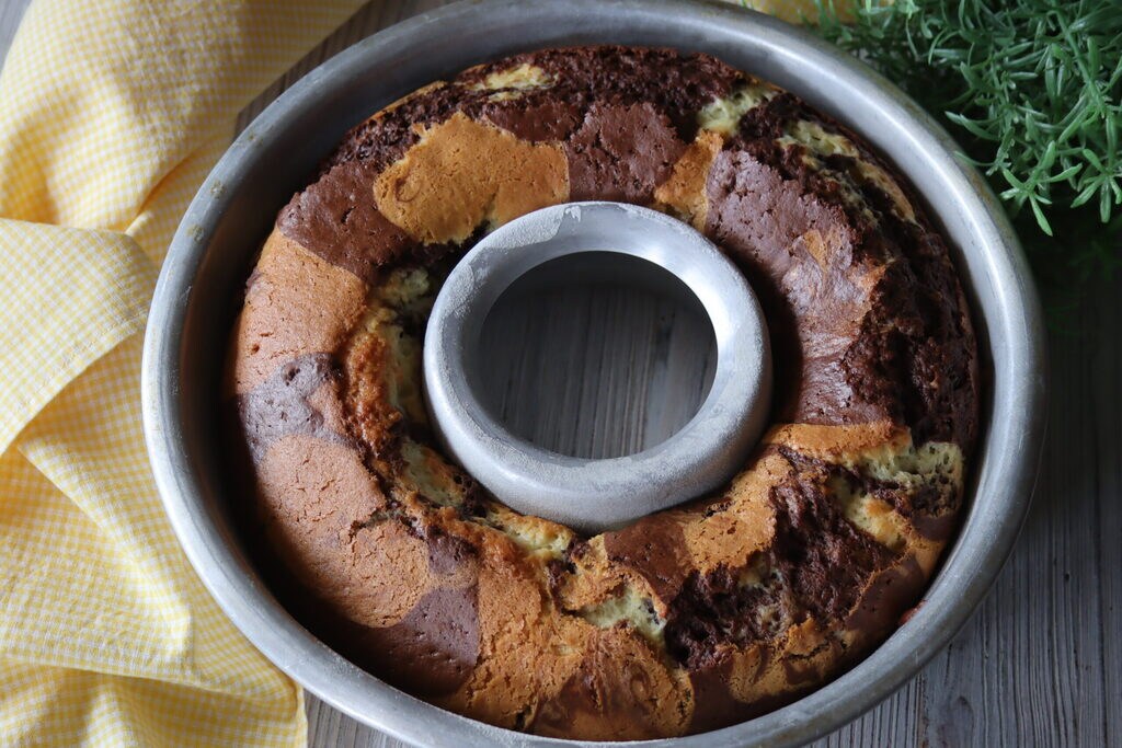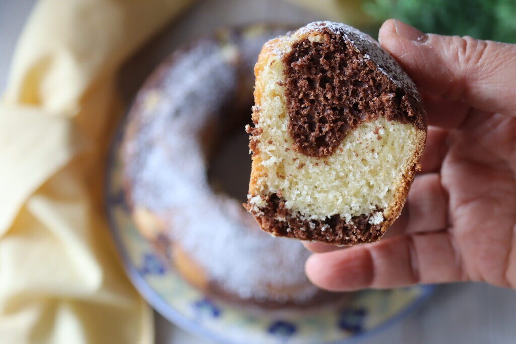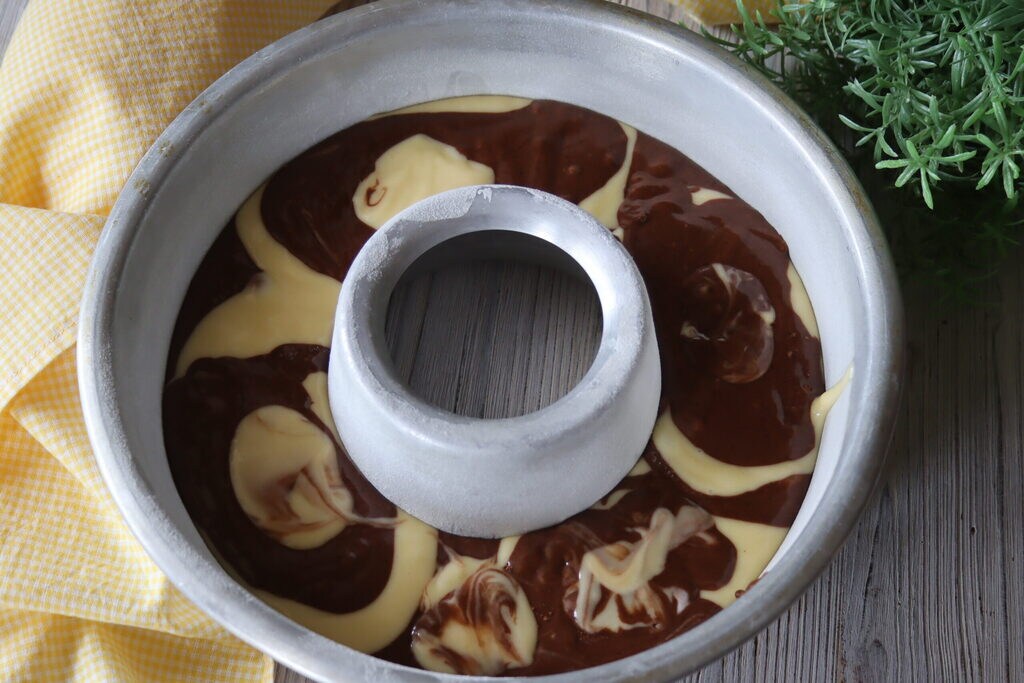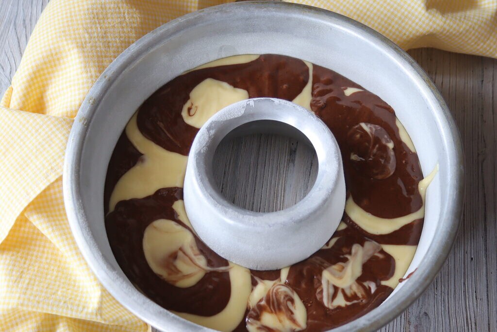 I divide the batter into two bowls and in one I add the sifted bitter cocoa powder, mix well, and then alternate them as I pour them into the already buttered and floured pan.