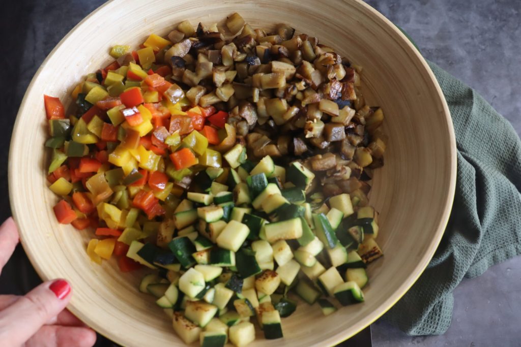 Once again, I remove the cooked eggplants from the Cocotte and place them next to the cooked bell peppers in a bowl.
