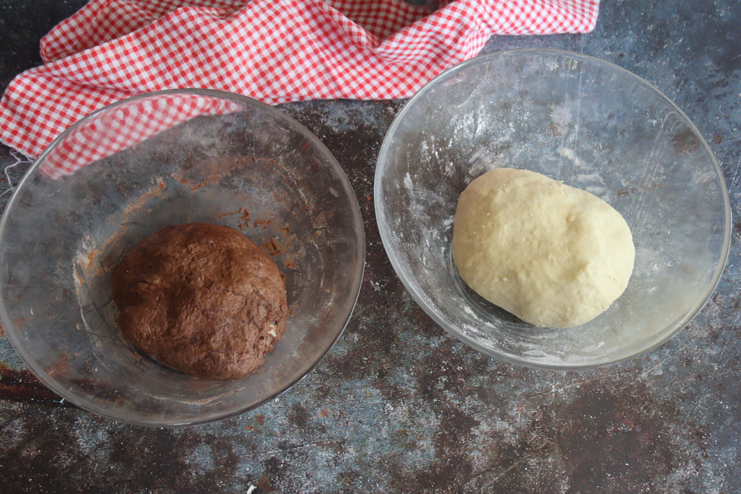 • Work the two dough pieces separately, cover them with plastic wrap and let them double in volume. This will take at least 2 hours.