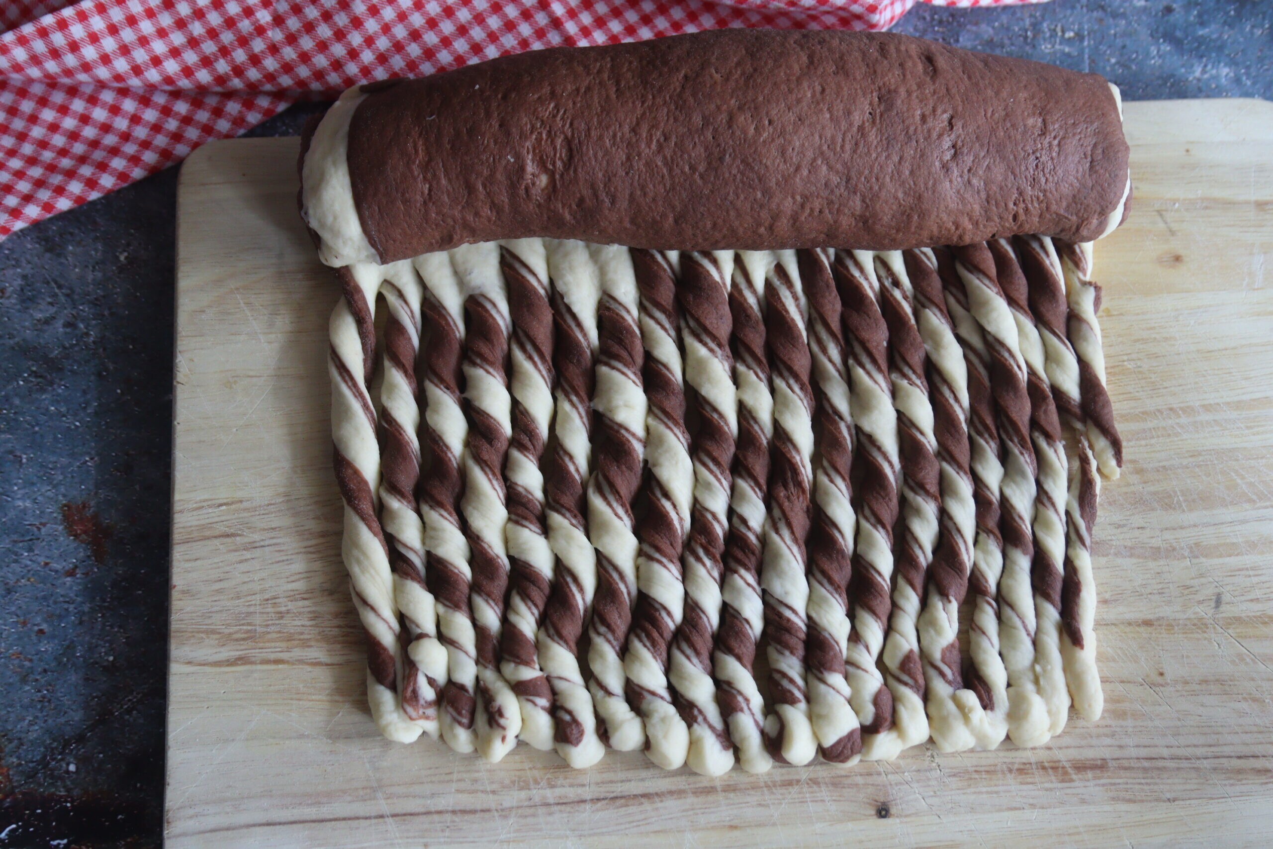 • On the opposite side, add dark chocolate flakes and roll the loaf bread to create a braid effect.