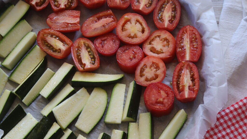 After washing and halving the zucchinis, cut them into thin sticks and place them on the baking tray with parchment paper.
