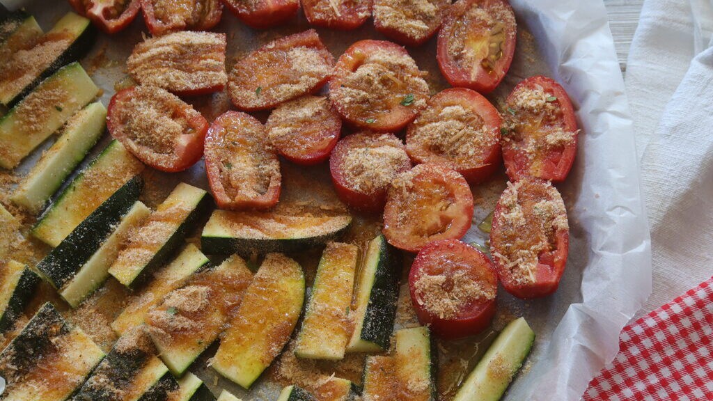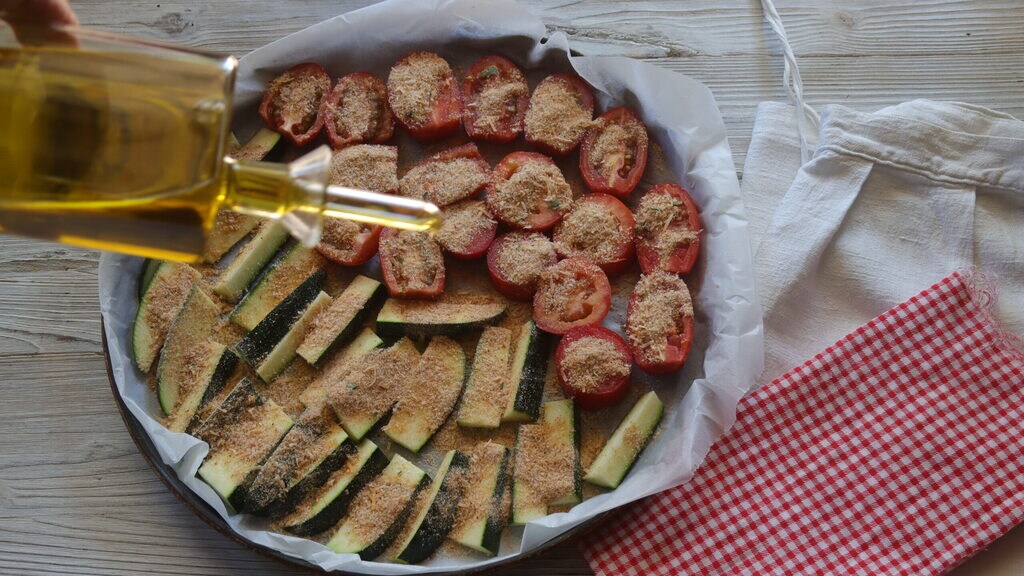 Halve the cherry tomatoes and place them on the tray next to the zucchinis. Prepare the breadcrumbs with salt, pepper, and oil, paprika, chopped basil, and mix everything, sprinkle over the vegetables.