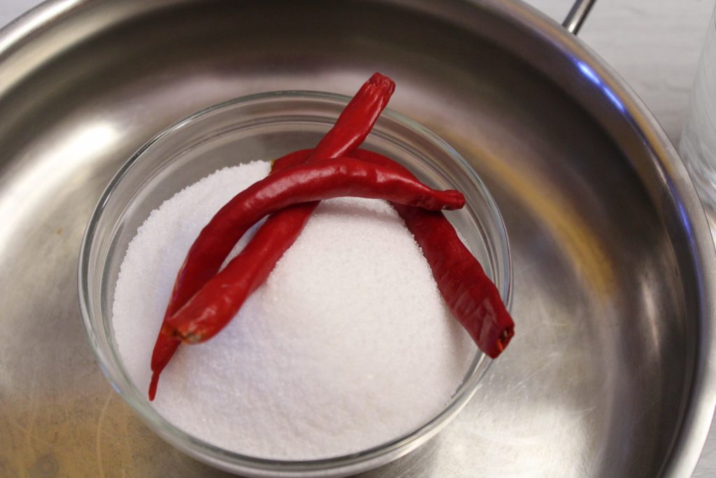For this recipe, you will need only three ingredients: Chilies and sugar, paprika…and then a little water.